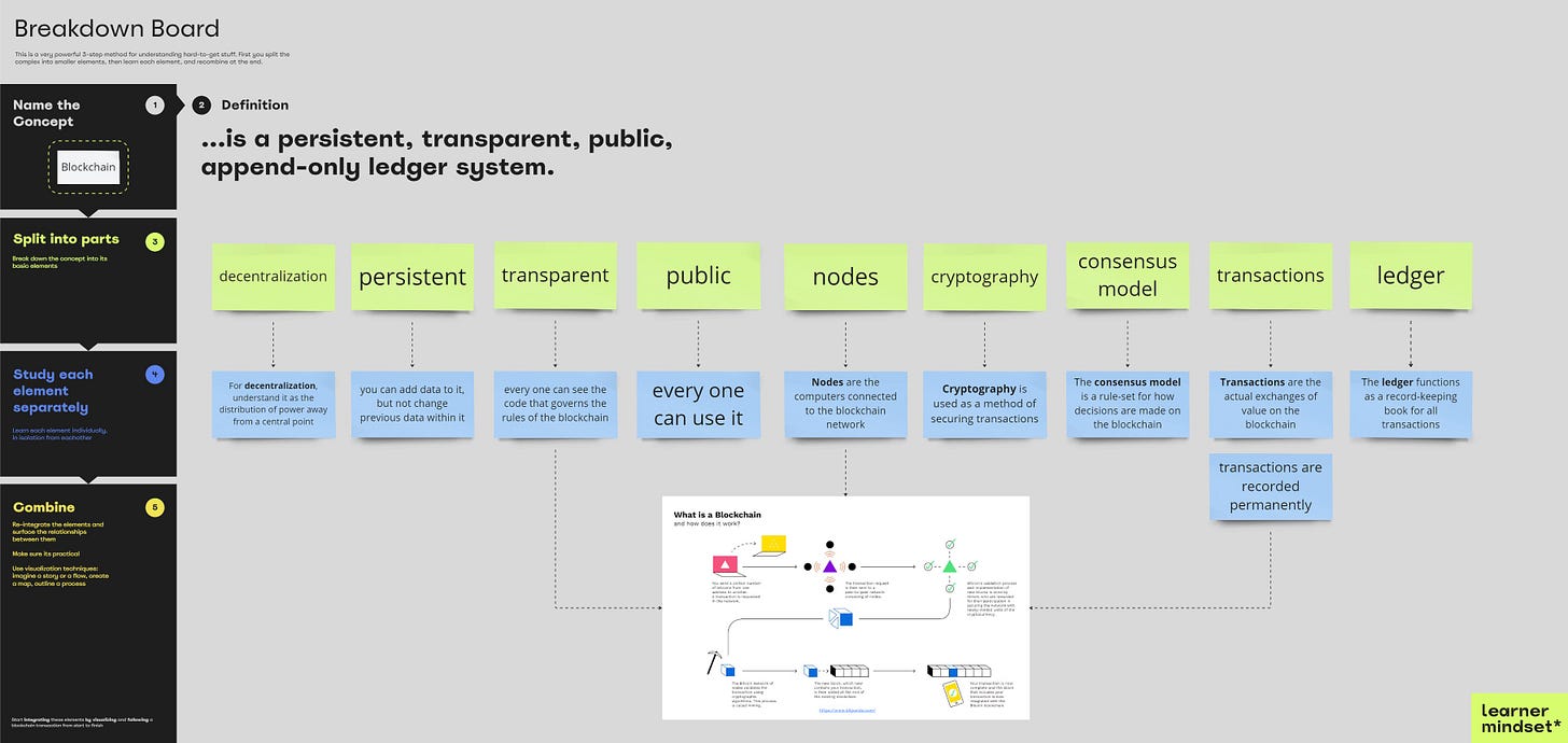After learning each part, write down how these parts interact and connect with one another. An integrated understanding will emerge as you synthesize the various components, providing you with a comprehensive view of the entire blockchain concept. Here, you could for example create diagrams or write paragraphs that describe the journey of a blockchain transaction, from initiation to being recorded on the ledger. It's important for this step to be as practical as possible, you need to experience the interplay between various parts through starting a mini-project or building a prototype, or simply through using parts of the concept you are trying to understand. In the blockchain example – it would involve you making some actual Bitcoin transactions, inspecting and interpreting the blocks, or even setting up your own node. It all depends on how deep you need to go with your understanding.