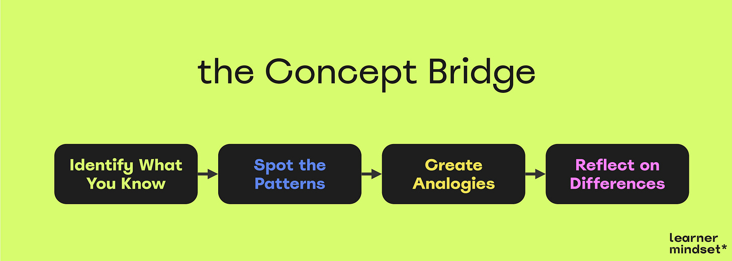 The “Concept Bridge” strategy is about connecting new, complex ideas to the things you already understand. This strategy makes learning easier by tying unfamiliar information to familiar concepts – creating 'bridges' in your memory that help you remember and make sense of the new stuff. It has four key stages where you Identify, Spot Patterns, Create Analogies and Reflect on Differences.