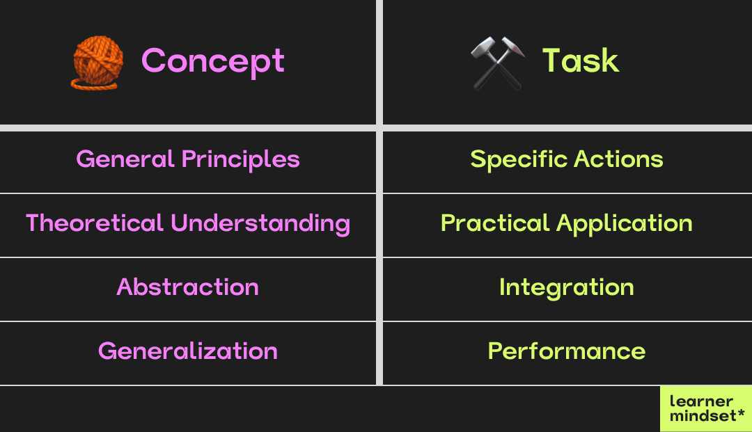 While both concepts and tasks can present learning difficulties, the nature of the challenge is different. Learning a concept might involve grappling with abstract ideas, while learning a task might involve integrating several concepts simultaneously into real-world practice.