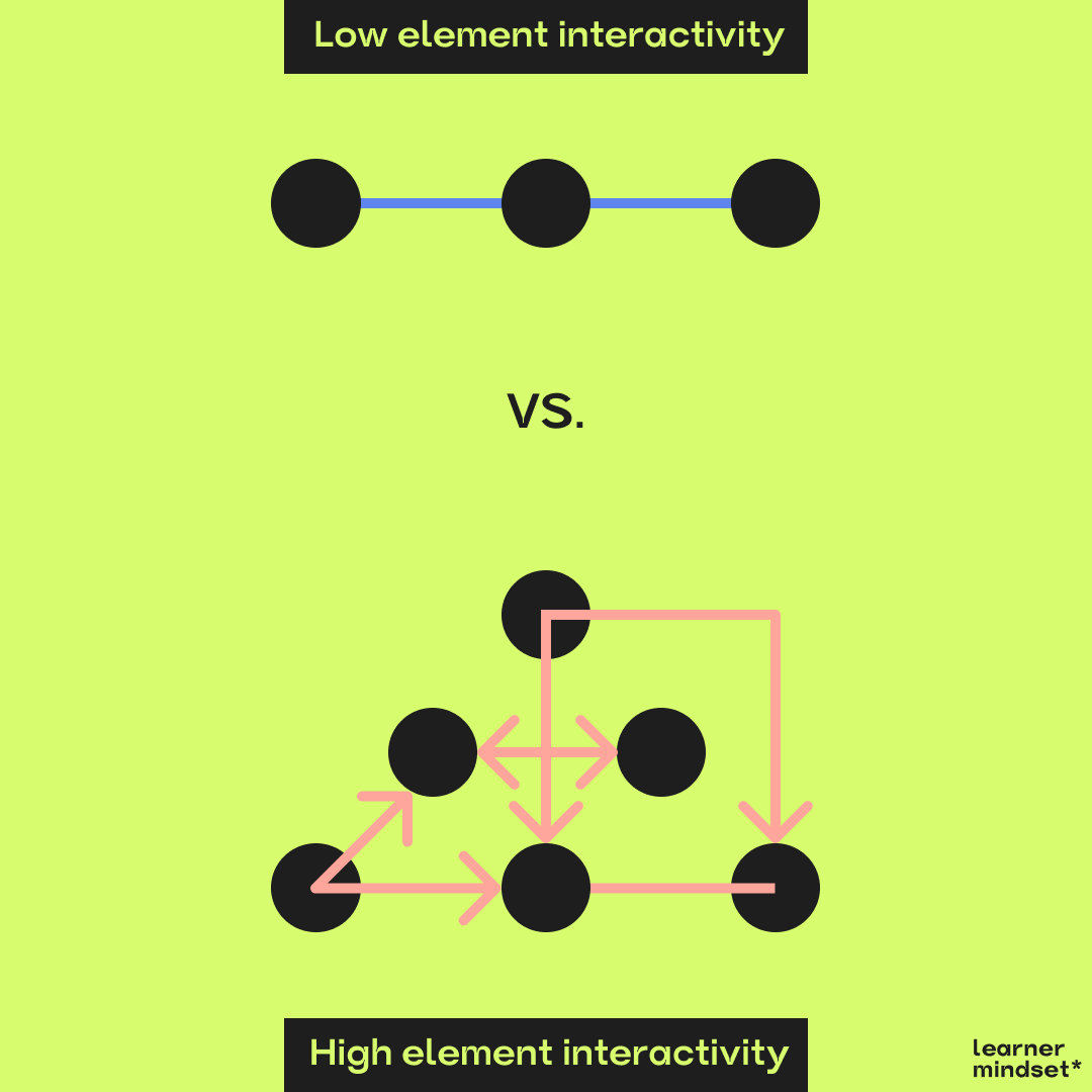 In addition, all concepts will have so-called low or high “element interactivity”. Element interactivity refers to the extent to which elements within the material being learned interact with each other. Elements are considered 'interacting' when the understanding of one element depends on the understanding of another. High element interactivity implies that to learn something effectively, one must understand how various elements influence one another; low element interactivity means that elements can be learned in isolation without much consideration of the others.